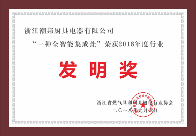 潮邦集成灶榮獲浙江省燃?xì)饩吆蛷N具廚電行業(yè)協(xié)會頒發(fā)的2018年度行業(yè)“發(fā)明獎”