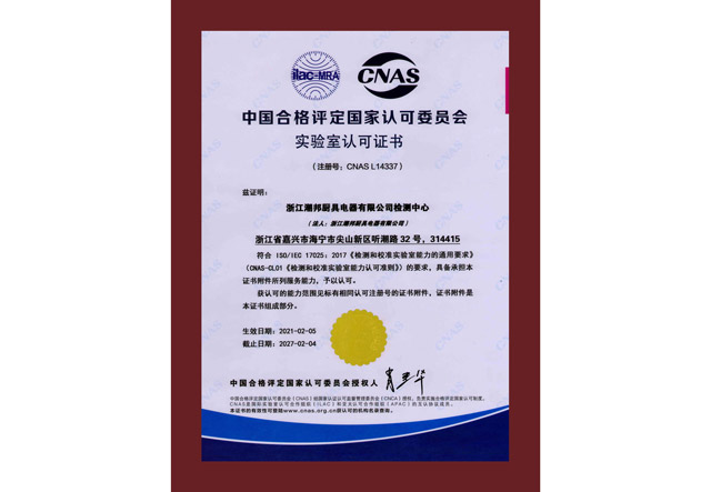 浙江潮邦廚具電器有限公司檢測中心獲CNAS實(shí)驗(yàn)室認(rèn)可