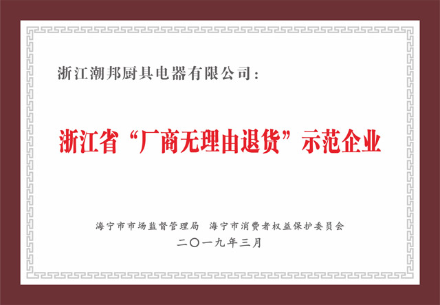 潮邦集成灶榮獲浙江省 “廠商無理由退貨” 示范企業(yè)
