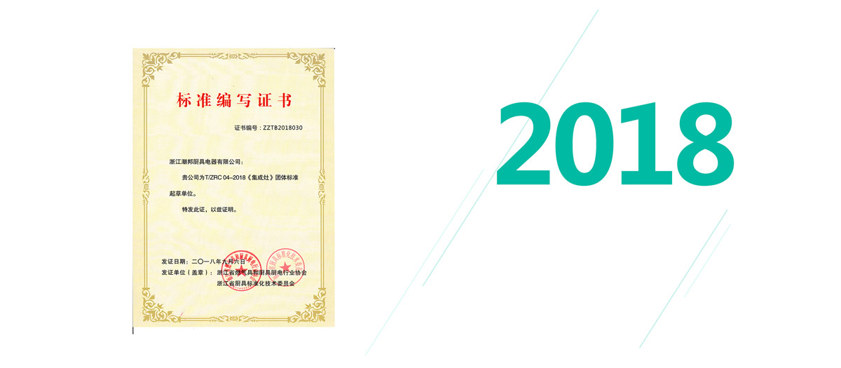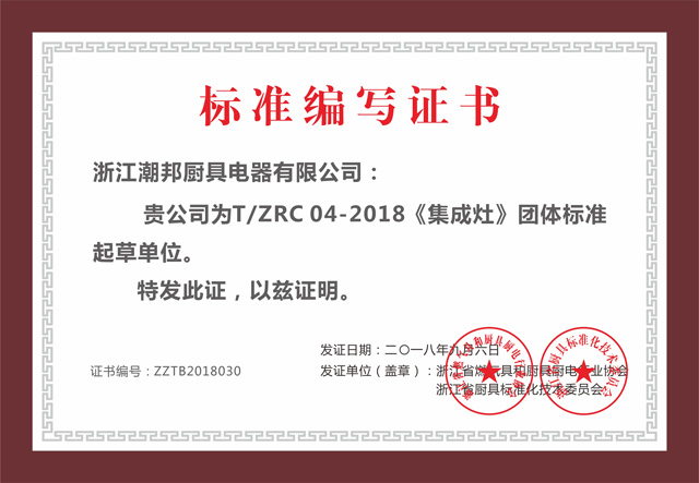 潮邦集成灶被浙江省燃?xì)饩吆蛷N具廚電行業(yè)協(xié)會授予T/ZRC 04-2018《集成灶》團(tuán)體標(biāo)準(zhǔn)起草單位