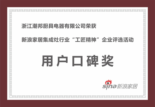 潮邦集成灶榮獲新浪家居集成灶行業(yè)”工匠精神“企業(yè)評選活動”用戶口碑獎”