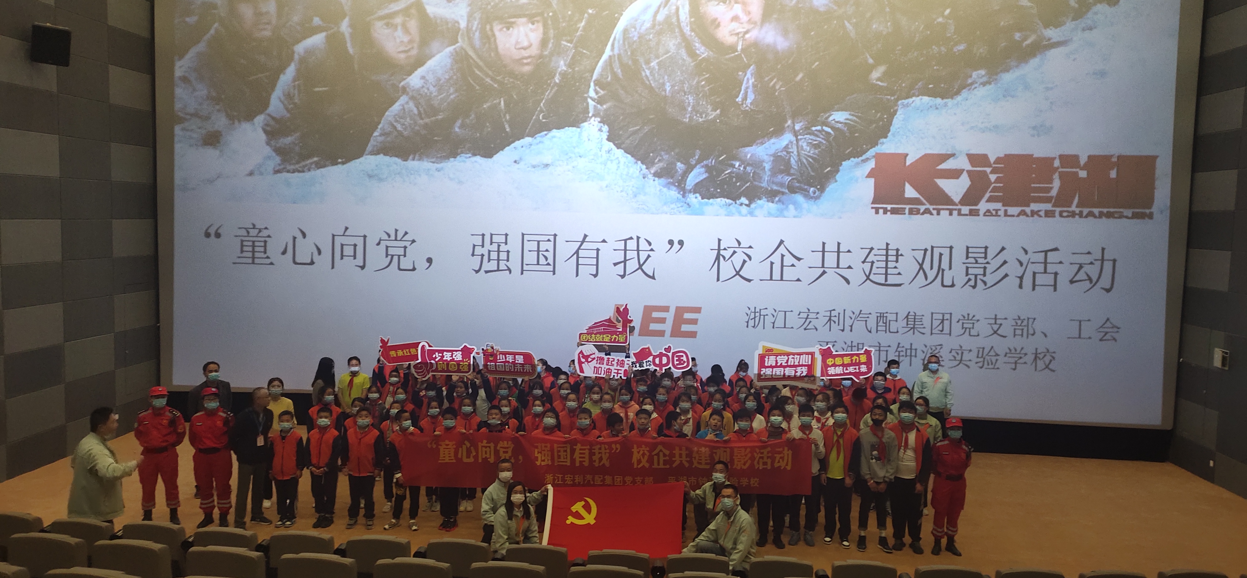 金秋十月,秋風送爽,浙江宏利汽配集團黨工委攜手平湖市鐘溪實驗學校,開展“請黨放心,強國有我”觀影活動。宏利黨工委自成立伊始即與鐘溪實驗小學結成“校企共建”,每年組織 “助學、助教、助建”活動。此次活動創新活動載體,在集團黨支部,各公司工會的大力支持下,近20余人參加與組織六年級三個班近120余人組織觀看《長津湖》。