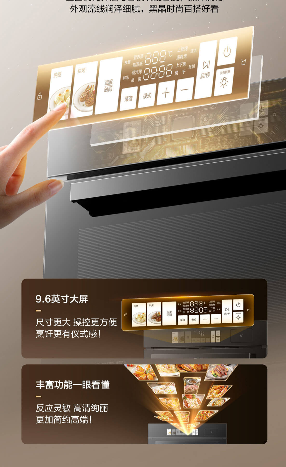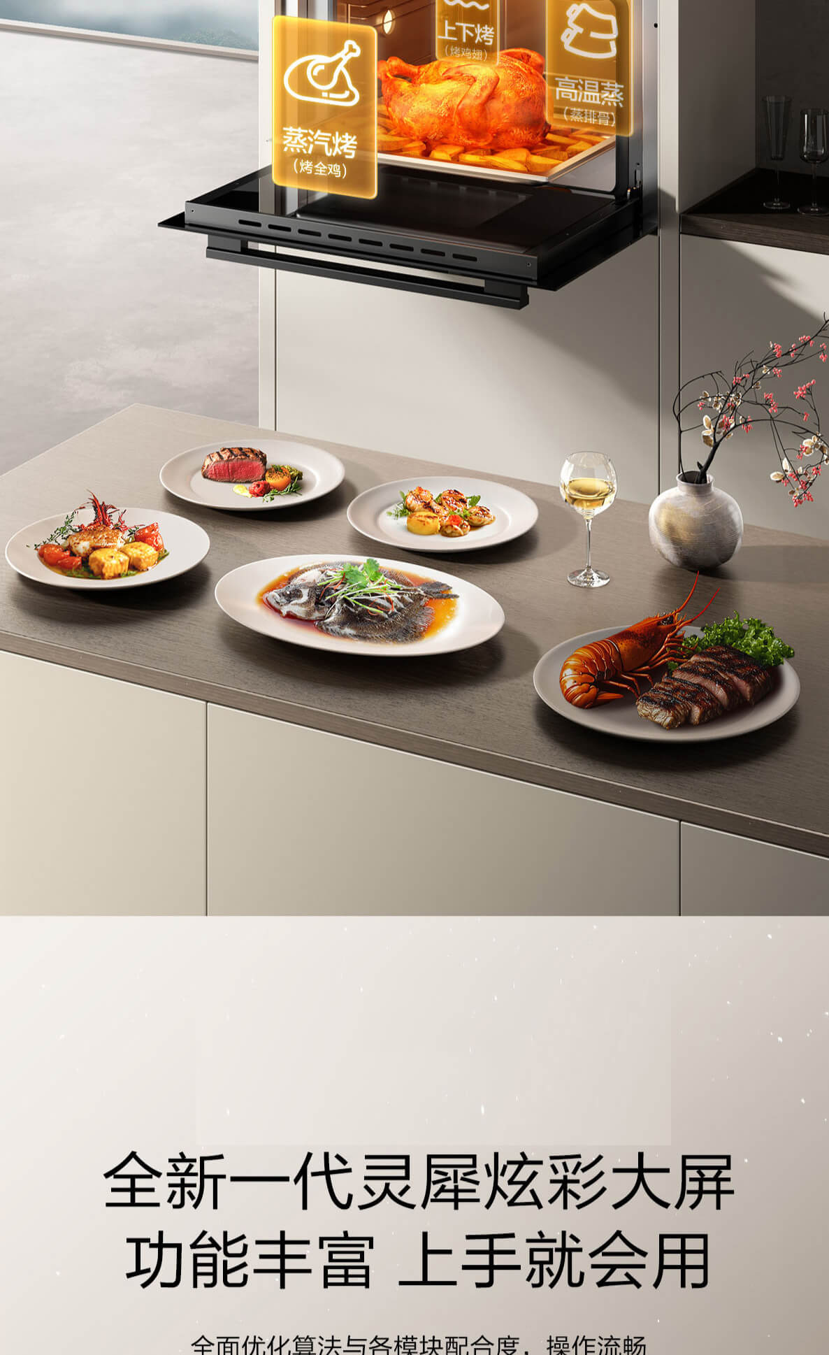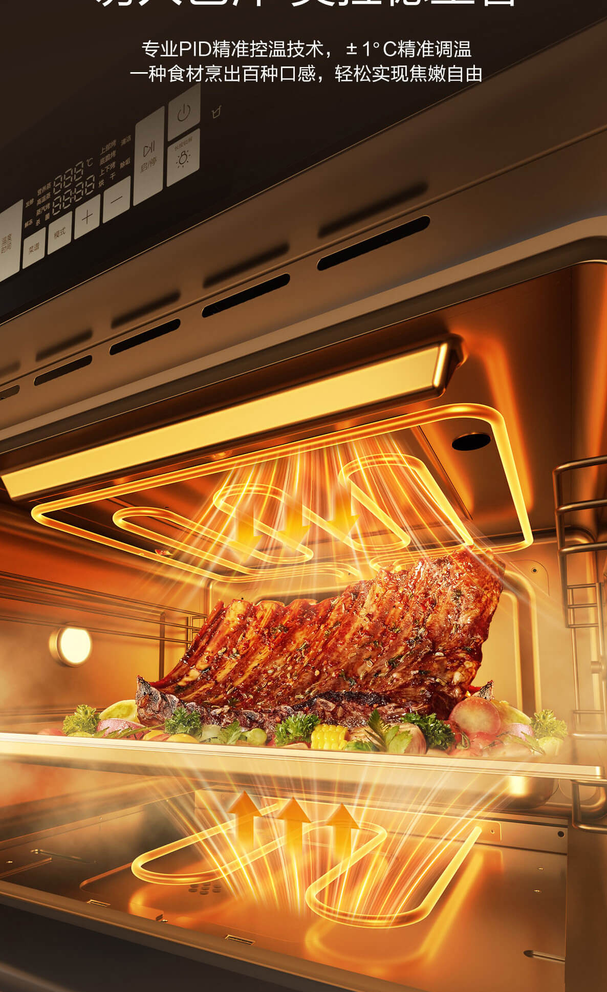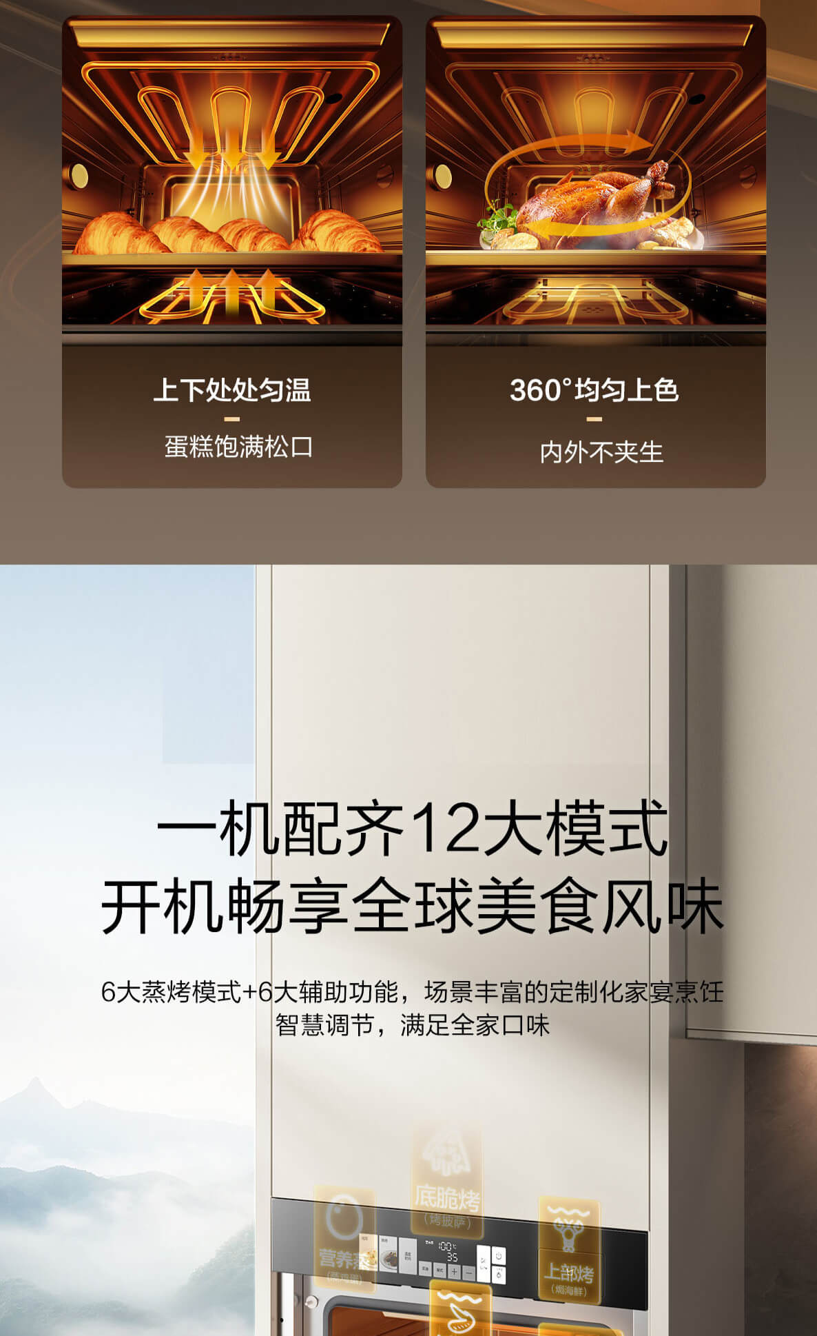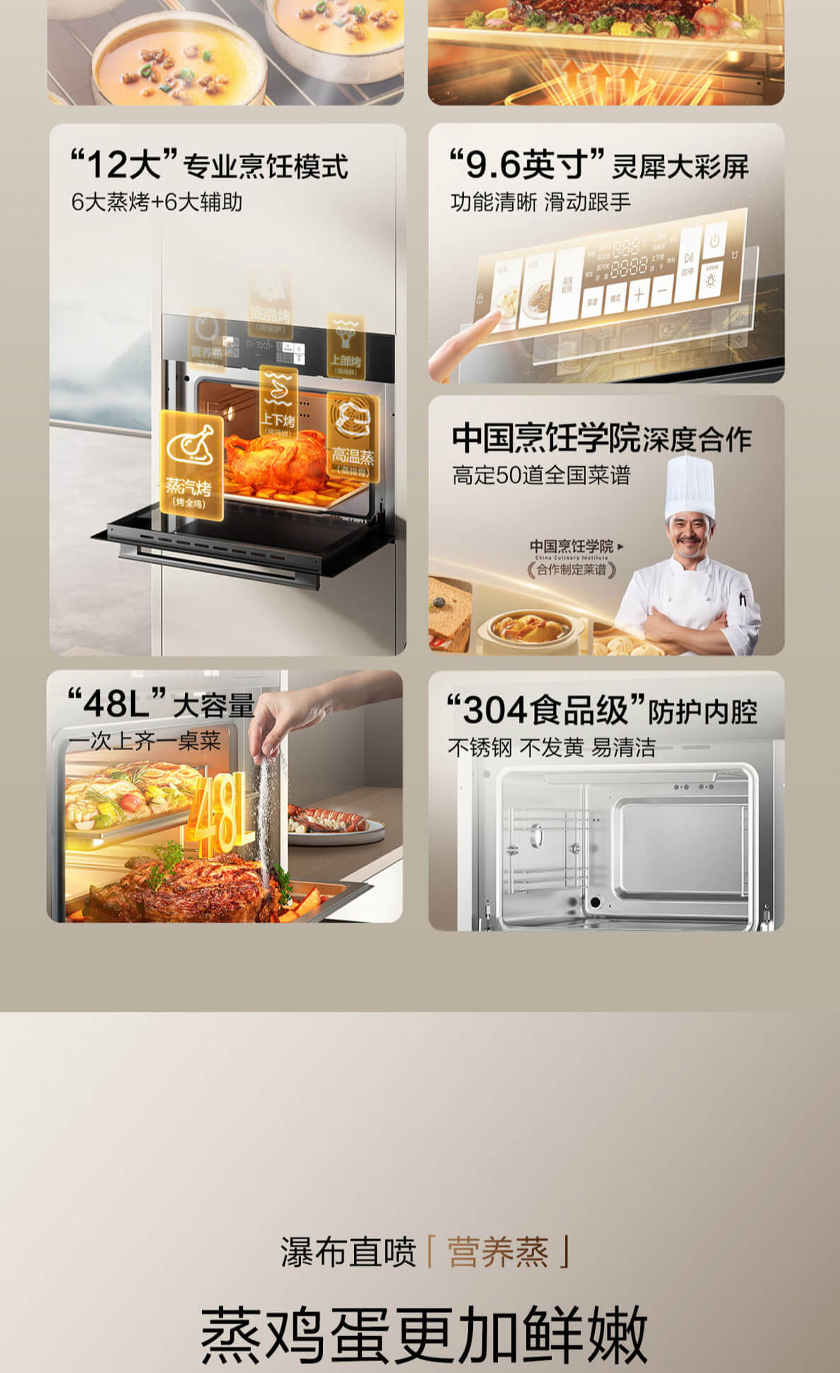 靈犀炫彩大屏,48L大容量,十二大專業(yè)蒸烤模式,上下雙管烤,直噴瀑布蒸汽,全304食品級(jí)不銹鋼,一鍵高溫殺菌