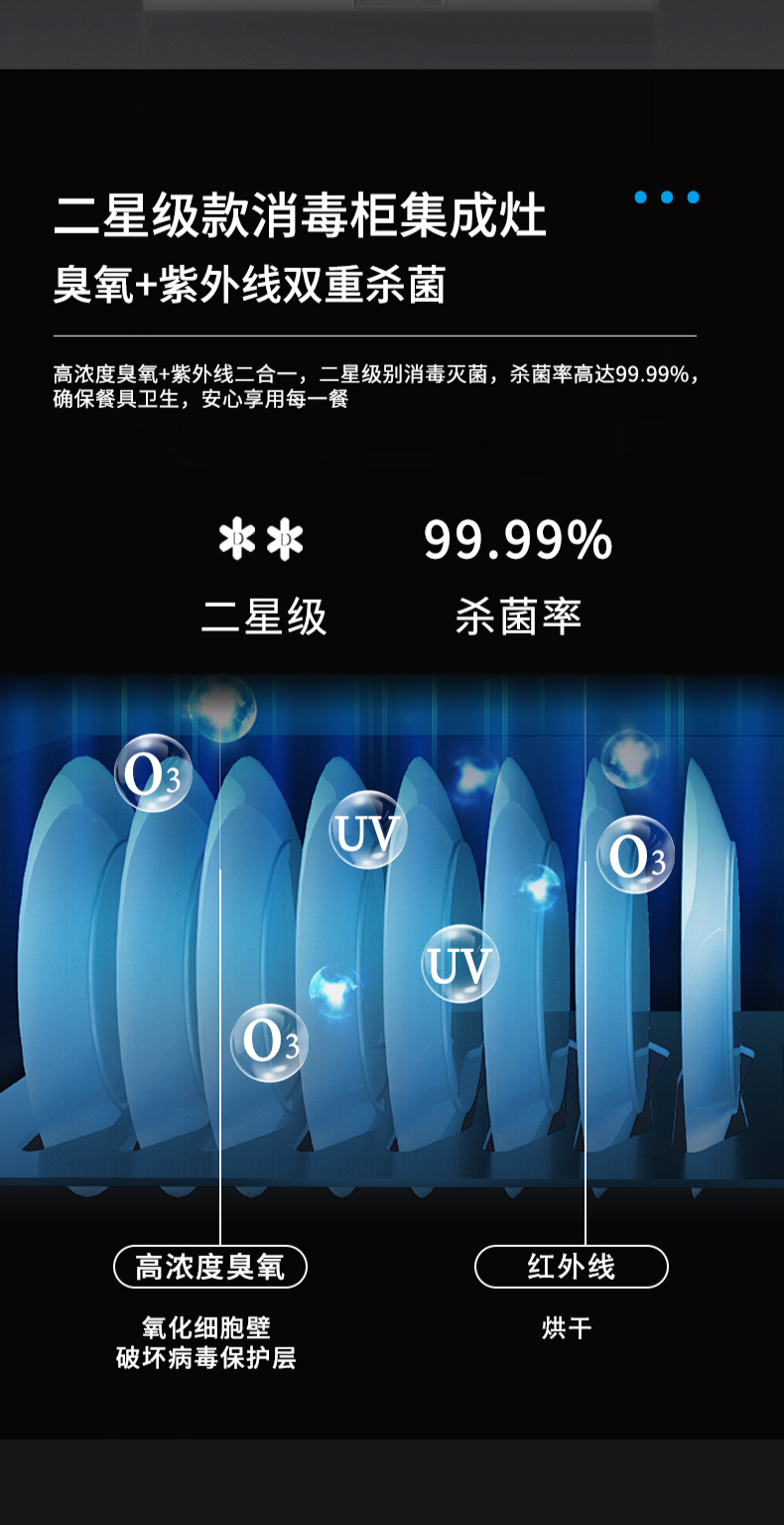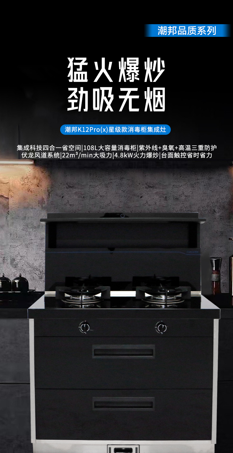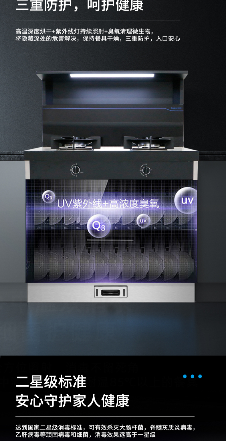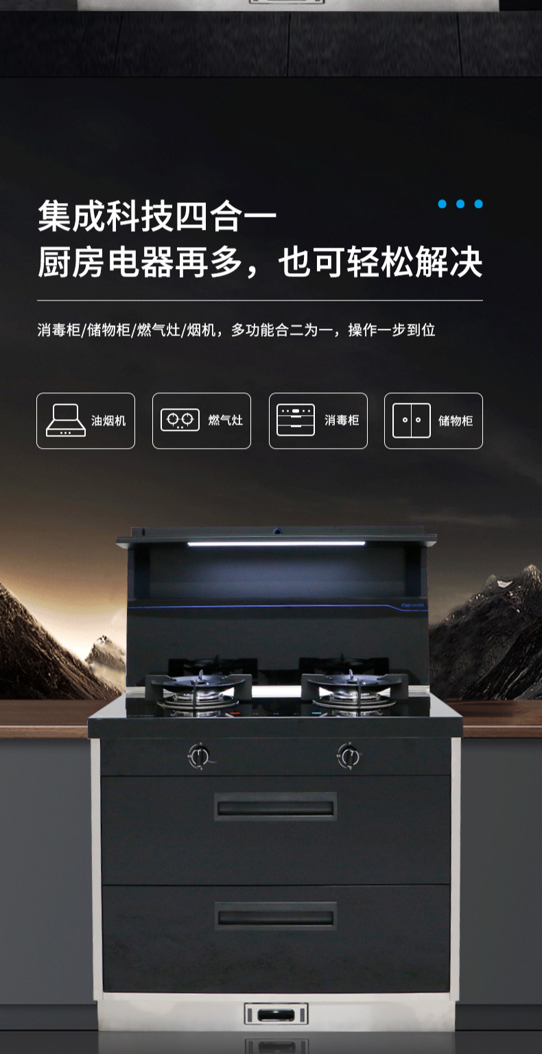 集成科技四合一省空間|108L大容量消毒柜|紫外線+臭氧+高溫三重防護 伏龍風道系統(tǒng)|22m3大吸力|4 8kW火力爆炒|臺面觸控省時省力