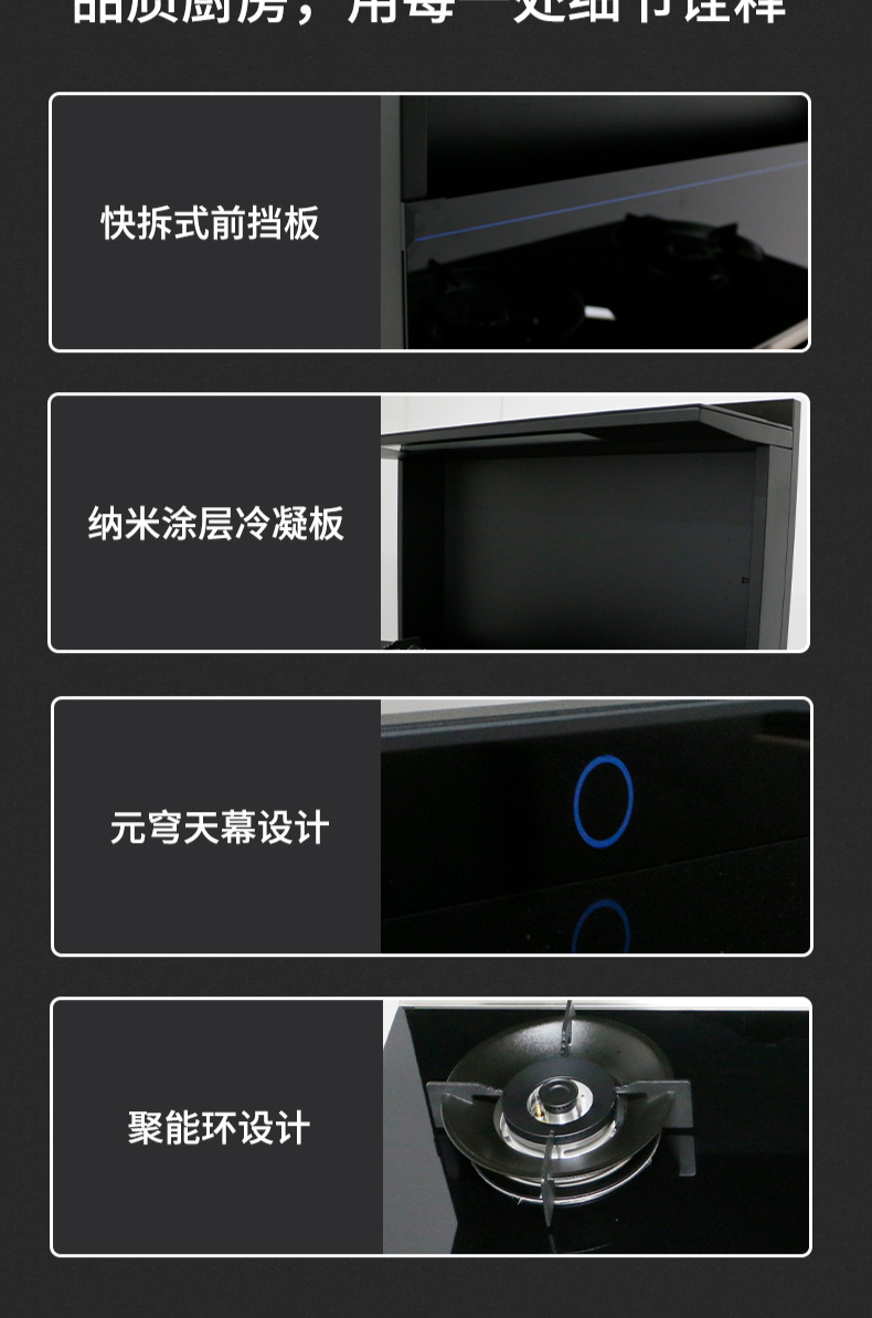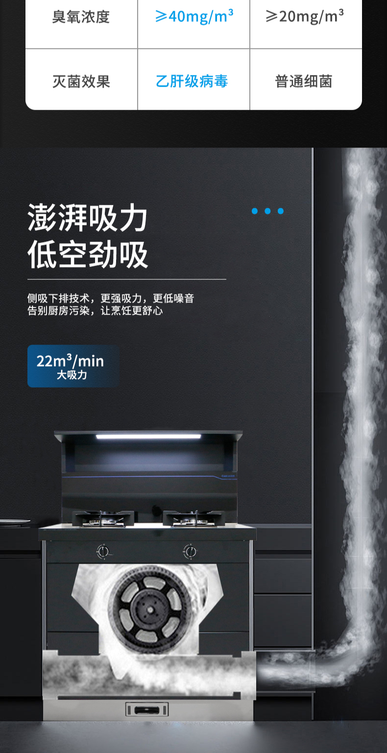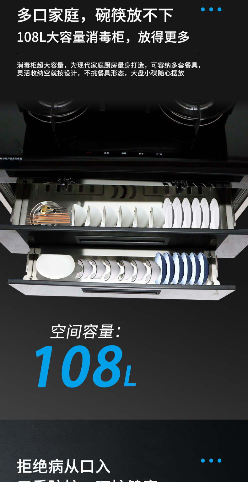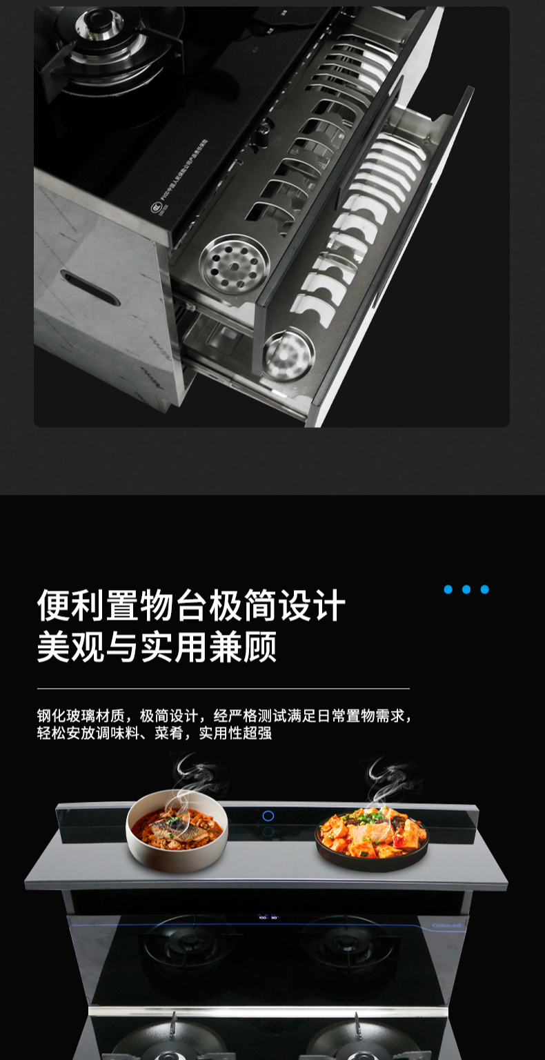 集成科技四合一省空間|108L大容量消毒柜|紫外線+臭氧+高溫三重防護 伏龍風道系統(tǒng)|22m3大吸力|4 8kW火力爆炒|臺面觸控省時省力