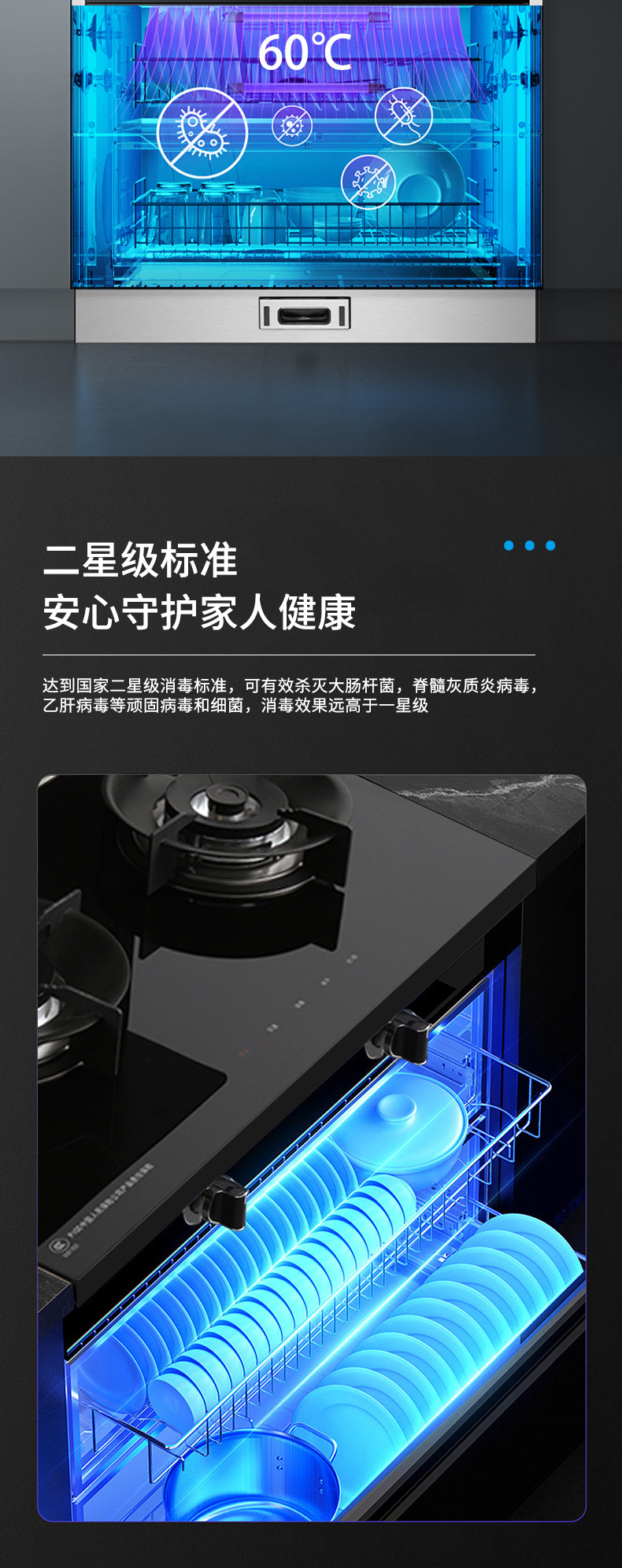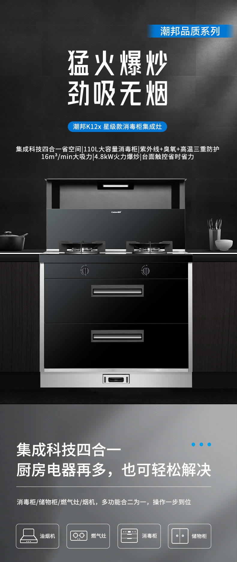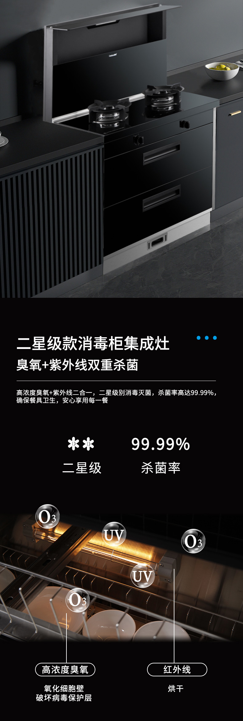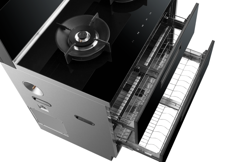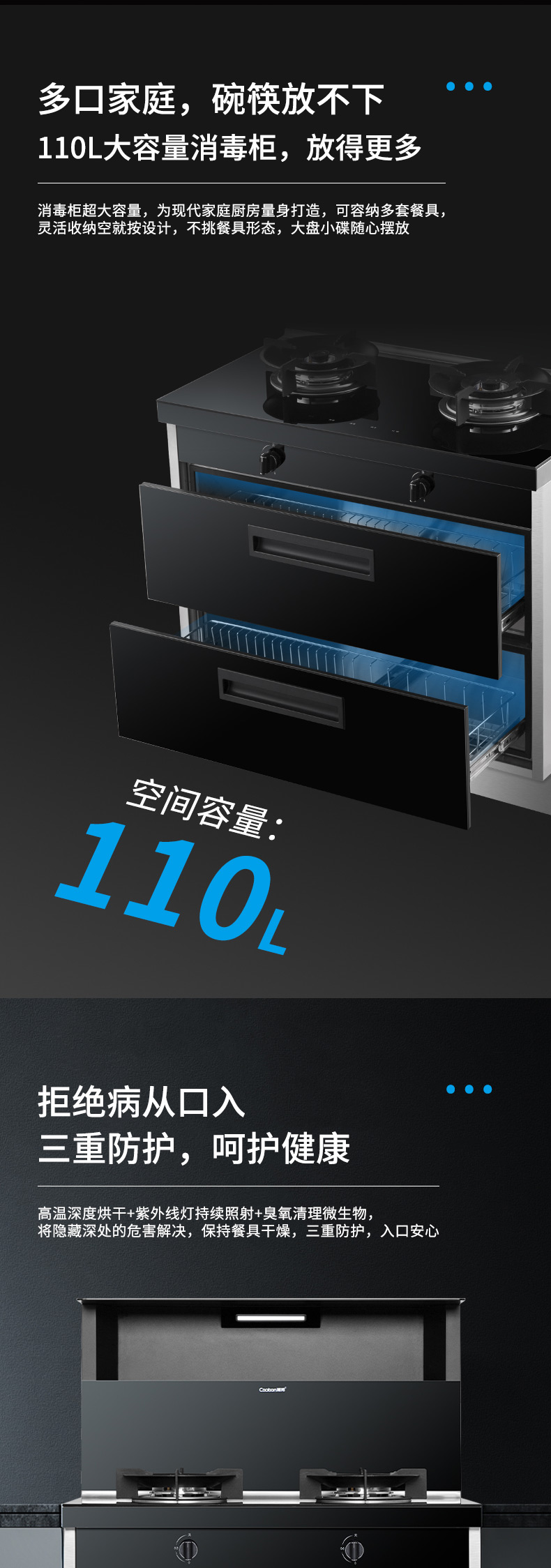 集成科技四合一省空間,110L大容量消毒柜,紫外線+臭氧+高溫三重防護,臺面觸控省時省力